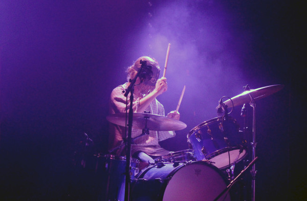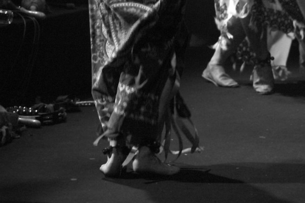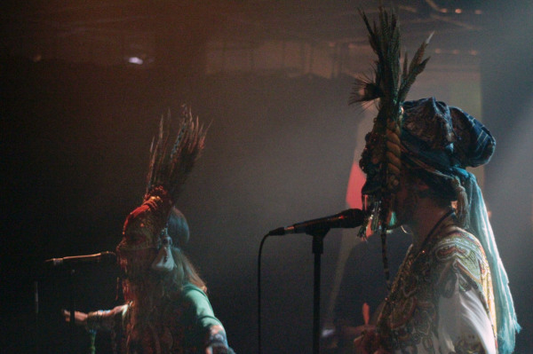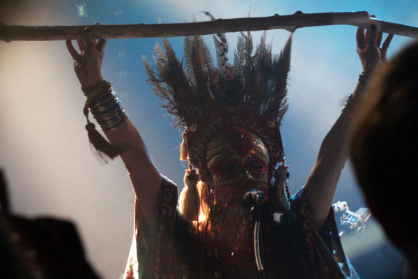 La performance fut à la hauteur de notre curiosité et de notre excitation. Sans un mot à l’égard du public – mystère rime avec mutisme -, la tribu suédoise a investi et habité la scène du Trabendo comme peu auparavant. Sept drôles d’individus accoutrés comme s’ils allaient faire une cérémonie païenne au milieu du désert du Karakoum se sont livrés à une messe colorée des plus réjouissantes, à grand renfort d’accessoires que le Quai Branly n’aurait pas reniés. Une initiation réussie au culte du dieu chèvre avec en introduction un morceau tiré du récent « Commune » et intitulé Talk To God. Le public ne se fait pas prier et s’exécute, immédiatement désinhibé ; impossible de rester de marbre devant un tel déploiement d’énergies positives.